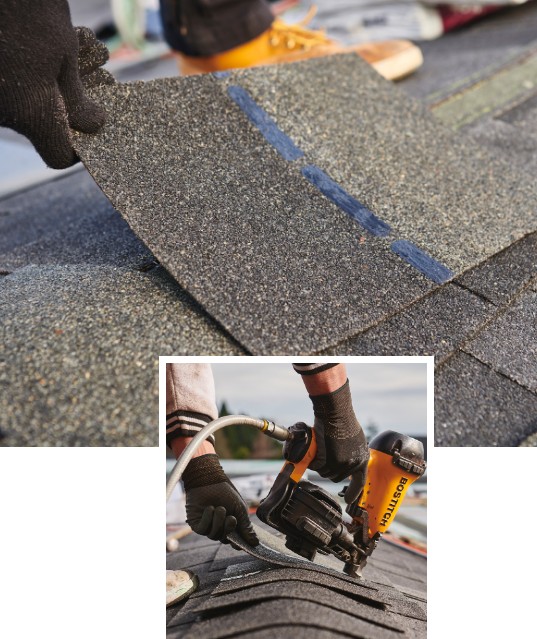 A new roof requires more than just shingles. It’s a cohesive, coordinated system including: 1) shingles, 2) underlayment, 3) ice and water underlayment, 4) starter shingles, and 5) hip & ridge shingles.